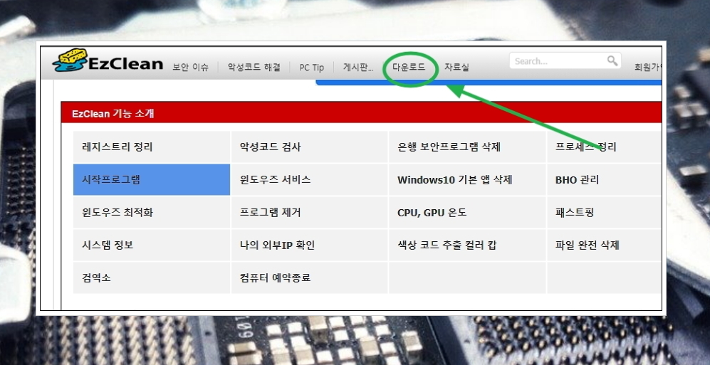 EzClean 공식 홈페이지에 접속했습니다. 메뉴에 있는 [다운로드]를 선택하여 최신 버전의 설치 파일을 다운 받아 실행해 주세요. 이지클린 기능 소개를 보면 갑자기 컴퓨터가 느려졌을때 도움이 되는 기능을 많이 갖추고 있다는 것을 알 수 있습니다.