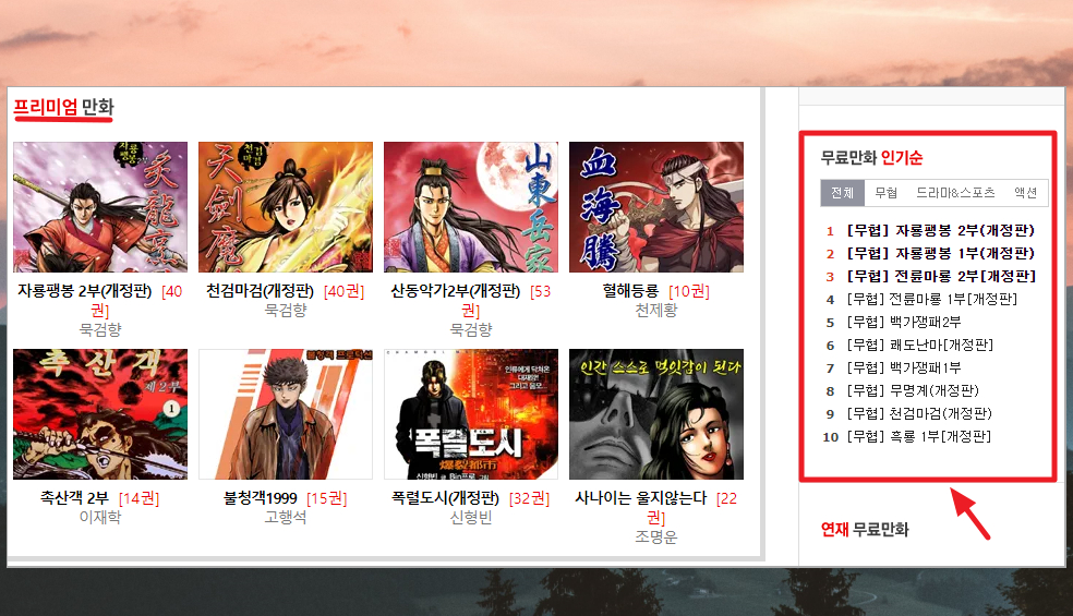 4. 저는 스포츠경향만화 사이트에 접속하면 꼭 인기 순위를 보는 편입니다. 여기에서 무협, 드라마, 스포츠, 액션 장르마다 어떤 작품이 인기가 있는지 알 수 있는데요. 높은 인기 있는 작품 중에서 볼만한 것이 매우 많아요. 또 한 가지는 프리미엄 시리즈인데요. 이 또한 무료만화를 감상할 수 있고, 처음부터 끝까지 볼 수 있습니다.