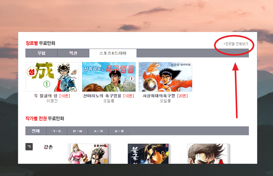 5. 좋아하는 장르가 있다면 장르별 무료만화 섹션을 살펴보아 주세요. 스포츠와 드라마를 좋아하시는 분들에게는 산마리노의 축구영웅, 사상 최대의 축구짱을 추천해 드리고 싶습니다. 여기서 장르별 전체 보기 버튼을 클릭해주세요.
