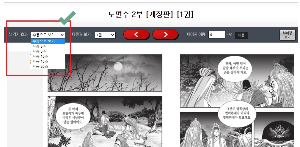 ▼보고 싶은 작품의 제목이나 썸네일을 클릭해 봅니다. 그럼 바로 무료만화 감상을 할 수 있습니다. 한 화면을 통해 2페이지씩 감상이 가능합니다. 다 보고 난 후에는 오른쪽에 있는 페이지를 마우스로 클릭하면 다음 페이지로 넘길 수 있습니다. 감상 화면을 보면 좌측 상단에 자동넘김 선택 기능이 있습니다. 해당 기능을 사용하면 마우스 클릭 없이 자동으로 페이지를 넘길 수 있습니다. 반대쪽에는 권이동을 할 수 있는 셀렉트 박스가 마련되어 있으니 참고하시길 바랍니다.