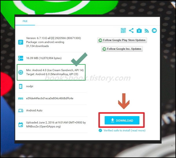 다운로드 버튼을 누르시면 되는데요. 주의깊게 보셔야 될 부분이 있습니다. 바로 녹색박스 표시인데요. Min과 Target을 보고, 자신의 스마트폰의 OS 버전이 이에 맞는지 확인해야 합니다.