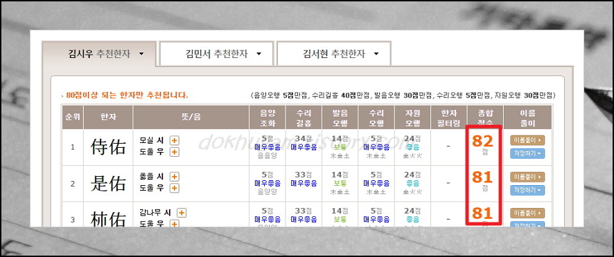 그러면 성명에 사용할 수 있는 한자를 추천해줍니다. 무료로 이용하시는 분들은 5개씩 확인할 수 있는데요. 높은 점수 순으로 나열된 것이기 때문에 이정도만 참고하셔도 많은 도움이 된답니다. 물론 자세하게 알고 싶으시면 유료로 사용하는 것도 좋아요.