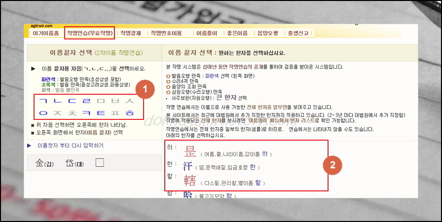 작명연습(무료작명)을 이용하면 되는데요. 방법은 간단합니다. 신생아의 성씨, 출생지, 생년월일을 입력한 후 위와 같이 성명에 들어갈 자음을 선택하면 됩니다. 파란색은 발음오행 모두 만족하는 것이니 파란색 위주로 선택하시면 좋아요. 자음을 선택하셨으면 ②번에서 한자를 선택해주세요.