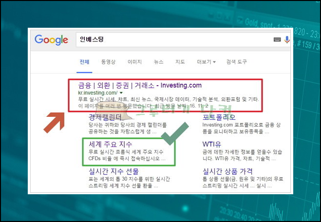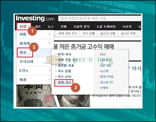 제가 자주 이용하는 곳은 인베스팅인데요. 보시면 '세계 주요 지수'를 무료 및 실시간으로 볼 수 있다고 나옵니다. 일단 인베스팅 닷컴을 선택하여 메인화면으로 들어가주세요.