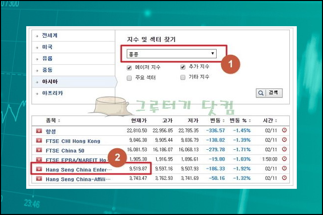 메뉴에서 '시장 ▷ 지수 ▷ 세계-지수'를 순서대로 클릭해 주세요. 홍콩h지수는 홍콩증권거래소의 주가지수 중 하나인데요. 우량 기업인 중국 국영기업의 주식을 모아 많든 것이랍니다.