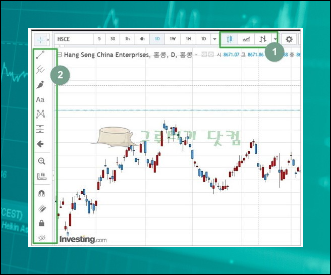 화면을 보면 차트모양을 영역, 캔들, 봉으로 바꿀 수 있습니다. 왼쪽에는 각종 분석도구(패턴, 포지션 등)이 있고요. 지금까지 홍콩h지수 실시간으로 차트보는 방법을 알려드렸는데요. 차트 아래쪽에는 거래량 그래프도 있답니다. 참고해주세요.