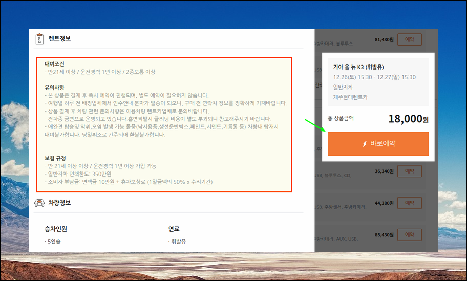 티몬 사이트에서 온라인으로 바로 예약을 진행할 수 있는데요. 인수시간, 반납시간, 정류소 등의 정보는 기본적으로 알고 있어야 해요. 그래야 수월하게 렌트카를 이용할 수 있어요.