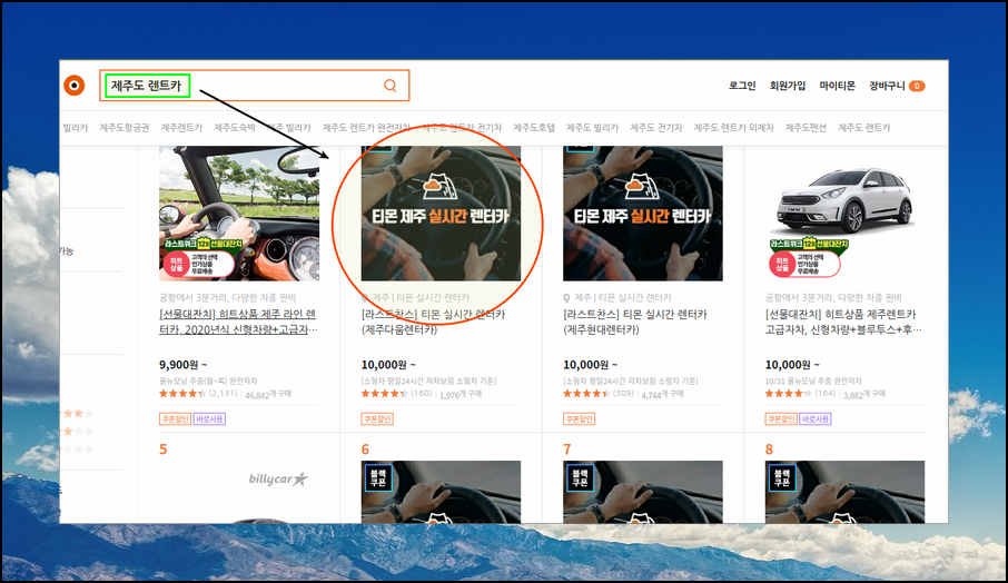 티몬 사이트에 접속하면 중앙 상단에 검색창이 있어요. 검색창에 "제주도 렌트카"를 입력한 후 엔터키를 눌러보세요. 그럼 여러 업체의 판매 게시글이 보일 거에요. 일반적으로 여기서 가장 싼곳을 선택하면 된다고 생각하실 수 있는데요. 여러 게시글을 잘 보시면 "티몬 제주도 실시간 렌트카" 서비스가 있어요. 해당 서비스를 클릭해 보세요.