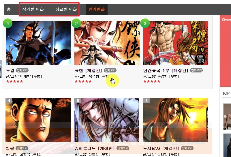 ▼이곳에서는 요즘 혈월객, 도편수, 천산도격, 창룡전기, 천산도객의 인기가 높습니다. 무협, 드라마, 스포츠, 액션 이렇게 4가지 장르 위주로 만화 작품을 만나볼 수 있는 곳입니다.