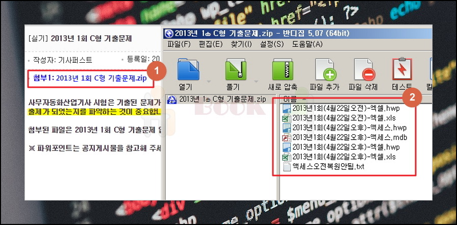 압축파일을 열어주세요. 산업기사 기출문제를 열어보시면 zip으로 압축된 파일이 있는데요. 파일 안에는 엑셀과 엑세스에 대한 문제와 직접 풀어볼 수 있는 파일이 들어 있답니다. 파워포인트의 경우에는 공지게시물에 있어요. 지금까지 치뤄졌던 사무자동화산업기사의 모든 시험문제는 없지만, 공부하기에는 충분합니다.