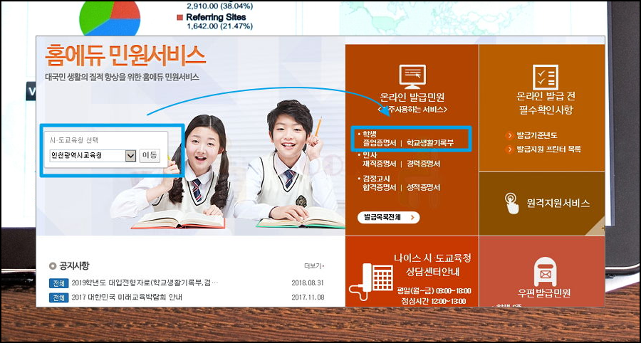 그럼 먼저 고등학교 생활기록부 발급을 위해서는 홈에듀 민원서비스를 클릭해주세요.