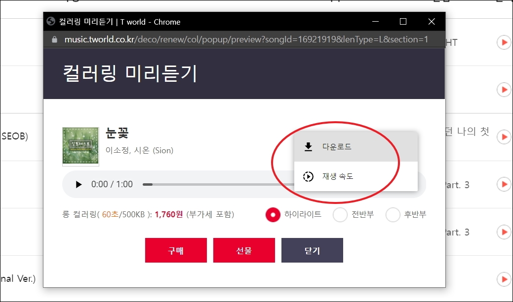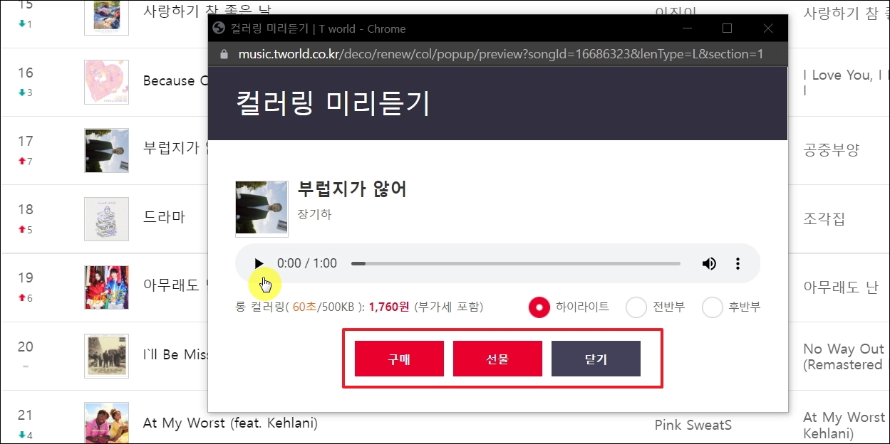 ▼해당 페이지에서 간단하게 컬러링 음원 바꾸는법을 알려드리겠습니다. 리스트에서 듣기 버튼을 누르면 [컬러링 미리듣기] 창이 열립니다. 여기에서 재생 버튼을 눌러 음원을 감상해 봅니다. 하이라이트, 전반부, 후반부 3가지 버전이 있으니 모두 들어보고, 어떤 것을 선택할 것인지 결정합니다. 그 다음 마음에 들면 [구매] 버튼을 누르면 됩니다. 이후 비용을 결제를 하고, 안내에 따라 설정을 진행하면 됩니다.