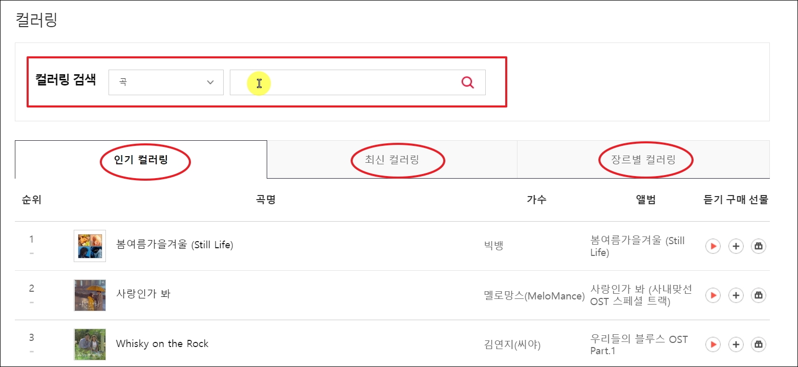 ▼원하는 음원을 검색할 수 있도록 되어 있는 검색창과 인기 음원 순위 차트가 나타났습니다. 여기서 통화연결음 대신 사용할 음원을 듣거나 구매, 선물을 할 수 있습니다.