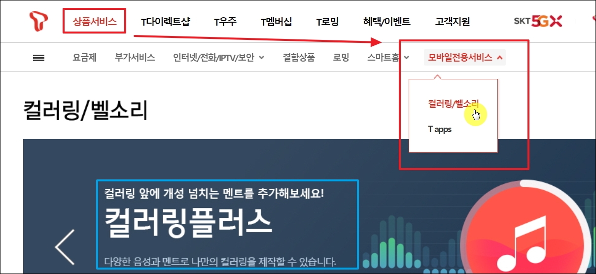 ▼SKT 통신사에서 운영하는 티월드 홈페이지에 접속했습니다. 인터넷 사이트를 통해 컬러링 바꾸는법을 진행하려면 [상품 서비스] 메뉴를 선택해야 합니다. 그럼 휴대폰 관련 서비스에 관련된 여러 메뉴가 나타나는데, 여기에서 가장 마지막에 위치한 [모바일 전용 서비스]를 선택하면 컬러링과 벨소리를 듣거나 바꾸는 서비스 페이지로 이동이 가능합니다.