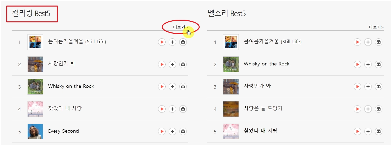▼컬러링과 벨소리 서비스에 관한 페이지가 열리면 이곳에서 인기 음원 베스트5를 만나볼 수 있습니다. 봄여름가을겨울, 사랑인가봐, 위스키온더락, 찾았다 내 사랑, 에브리 세컨드 등 요즘 인기 있는 곡으로 만들어진 음원이 보입니다. 더 많은 음원을 보기 위해 [더보기] 버튼을 클릭해 보겠습니다.