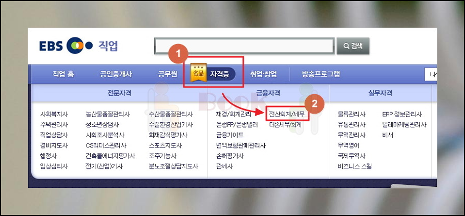 (2) 메뉴에서 '자격증 ▷ 전산회계/세무' 클릭