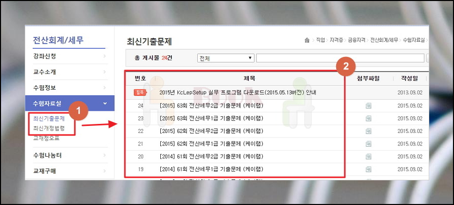 (3) 좌측메뉴에서 '수험자료실 ▷ 최신기출문제' 클릭