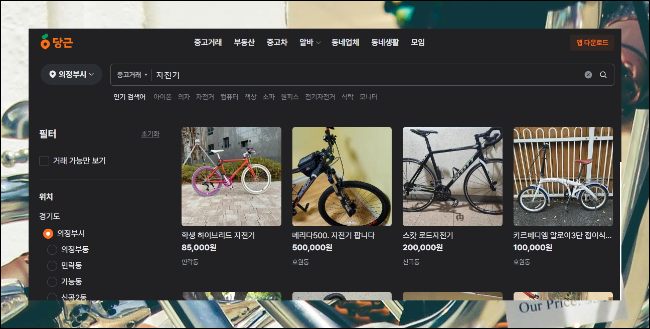 당근마켓은 가까운 이웃과 함께하는 중고자전거 거래의 장이에요. 근거리 거래가 가능해 직접 보고 구매할 수 있다는 것이 가장 큰 장점입니다.