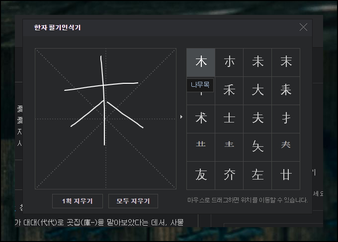 실제로 마우스를 이용해 글자를 그려보았습니다. 비록 모양이 완벽하지 않더라도 인식 시스템이 정확하게 파악해주는데요. 우측에 표시된 추천 문자들 중 그려서 찾기 원했던 한자를 선택하면 됩니다.