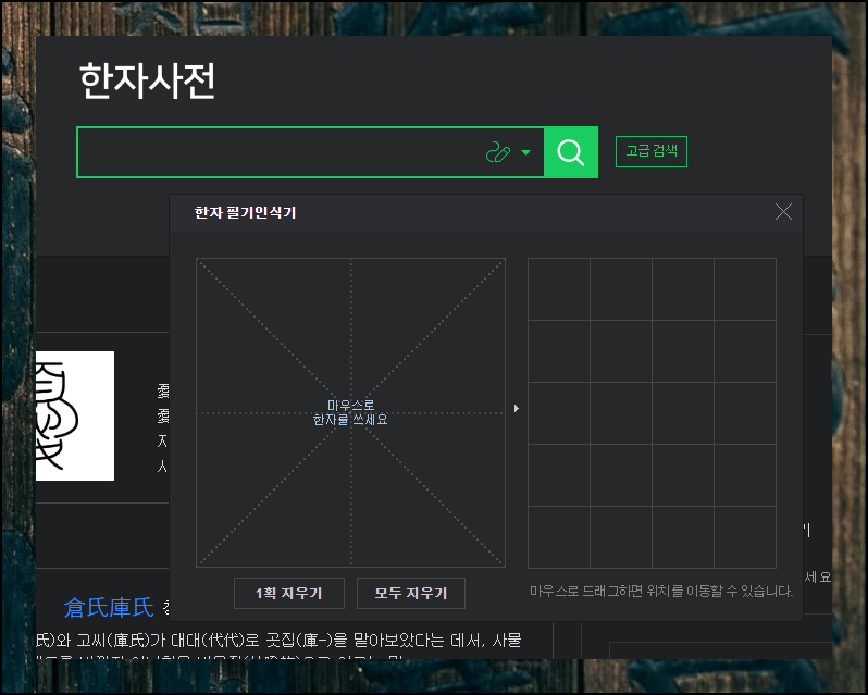 이 기능은 누구에게나 복잡한 옥편 사용법을 극복하도록 도와주죠. 화면에 한자를 간단히 그려서 바로 원하는 사전 정보를 순식간에 얻을 수 있습니다.