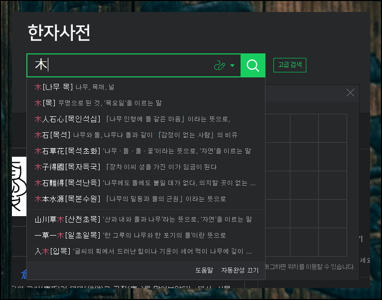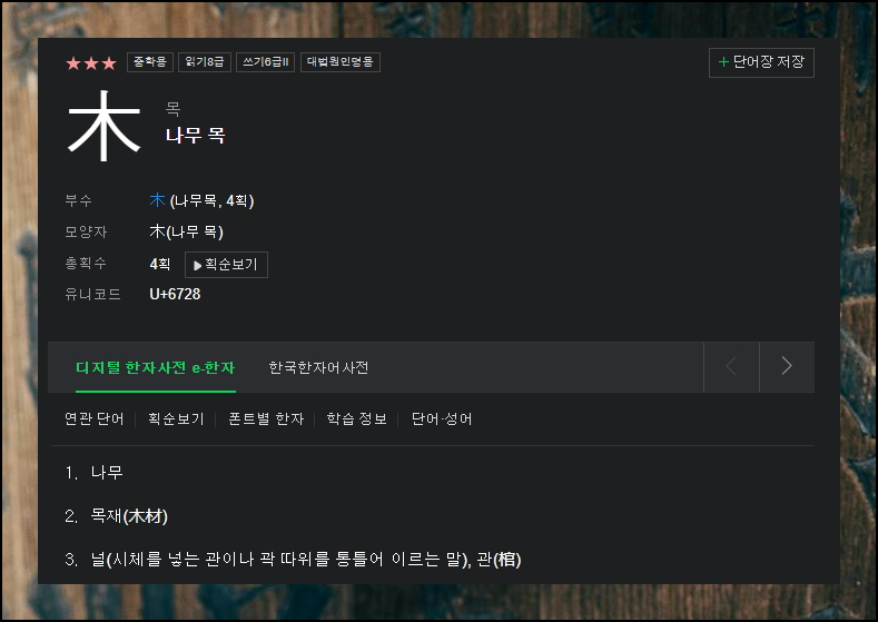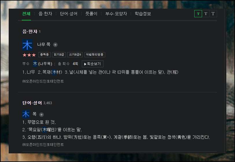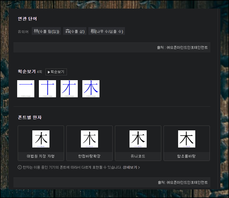 예를 들어 "나무 목"자의 경우에는 11가지나 되는 의미를 가지고 있네요. 실제 옥편보다 더 풍부한 설명을 인터넷으로 쉽고, 편리하게 찾아볼 수 있습니다.