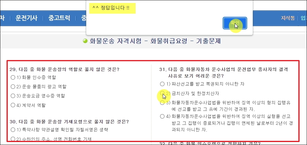 ▼이번에는 화물운송 관련 기출문제를 풀어보겠습니다. 여기에서도 과목별로 문제가 나뉘어 있습니다. 예상문제를 푸는 것도 자격증 시험 합격에 도움이 되오니 기출문제를 모두 풀어본 이후 이용해 보시길 바랍니다.
