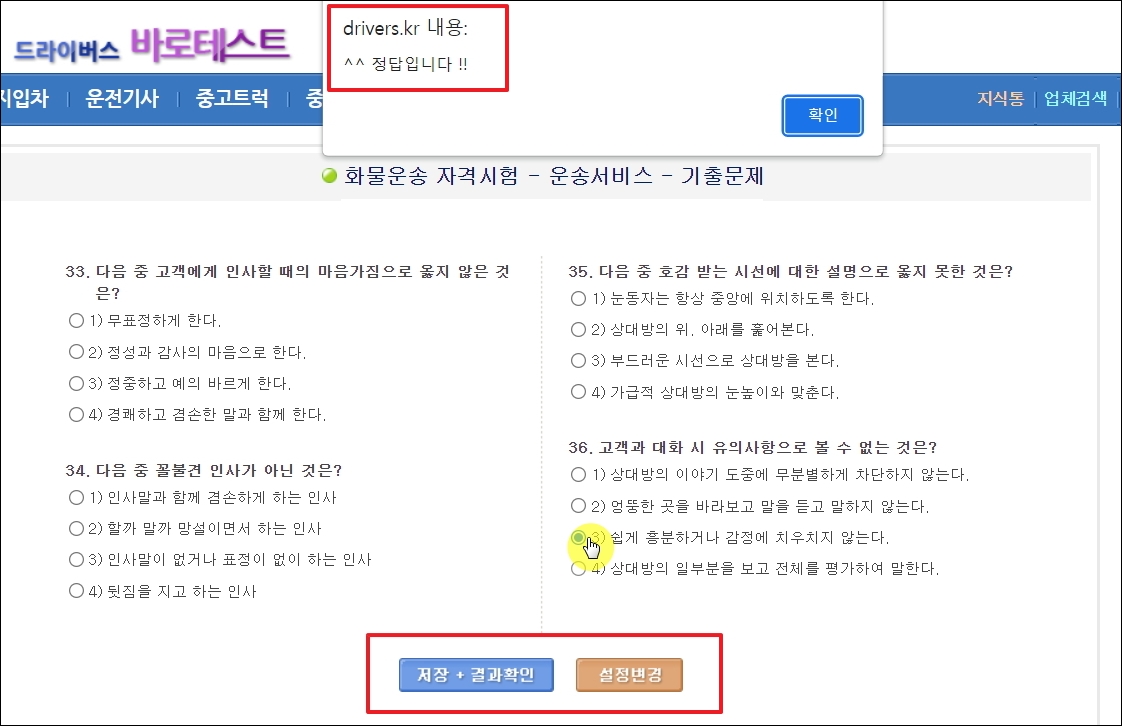 ▼문제를 푸는 방법은 앞서 언급한 바와 같습니다. 답이라고 생각되는 선택지를 마우스로 클릭하면 됩니다. 화물운송자격증 기출문제 화면 하단 부분을 보면 저장, 결과 확인, 설정 변경 기능을 하는 버튼이 마련되어 있습니다. 해당 기능을 사용하면 서비스 이용을 좀 더 효율적으로 할 수 있으니 참고하시길 바랍니다.