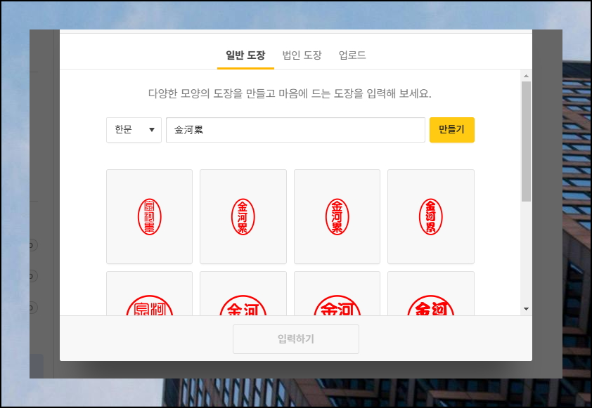 한글 대신 한문을 선택하고, 원하는 한자로 직인을 만들 수 있습니다. 한자 입력은 한글로 발음을 적은 뒤 한자 변환키를 사용하면 쉽게 할 수 있어요. 무료로 제공되는 다양한 서체로 고급스러운 결과물을 만들기 가능해요.