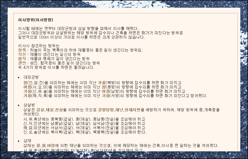 새 페이지에서는 다양한 운세 정보를 확인할 수 있어요. 특히 일반적인 방위와 삼재 정보를 통해 24년과 25년에 피해야 할 이사방향의 보는법을 자세히 설명해드립니다.