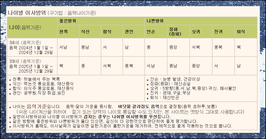 연령대별로 좋은 방위와 나쁜 방위가 구분되어 있습니다. 나쁜 방위인 안손, 징파, 오귀, 진귀, 퇴식은 각각 건강, 재산, 안전 등에 안 좋은 영향을 미칠 수 있으니 중요한 일을 계획하는 경우에 참고하세요.
