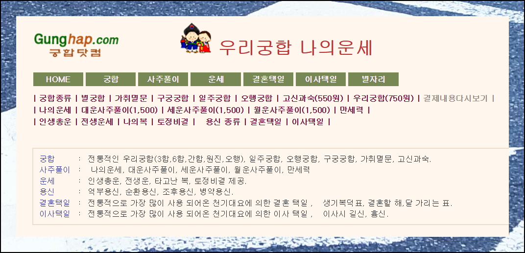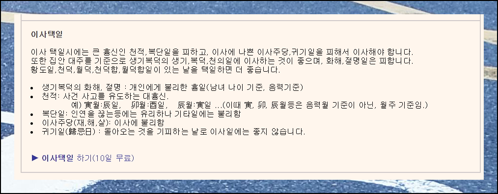 우리궁합 나의운세 페이지에서 이사택일 메뉴를 선택하시면 됩니다. 이 서비스를 통해 당신에게 맞는 날짜와 방향을 상세하게 보는법을 알려드립니다.