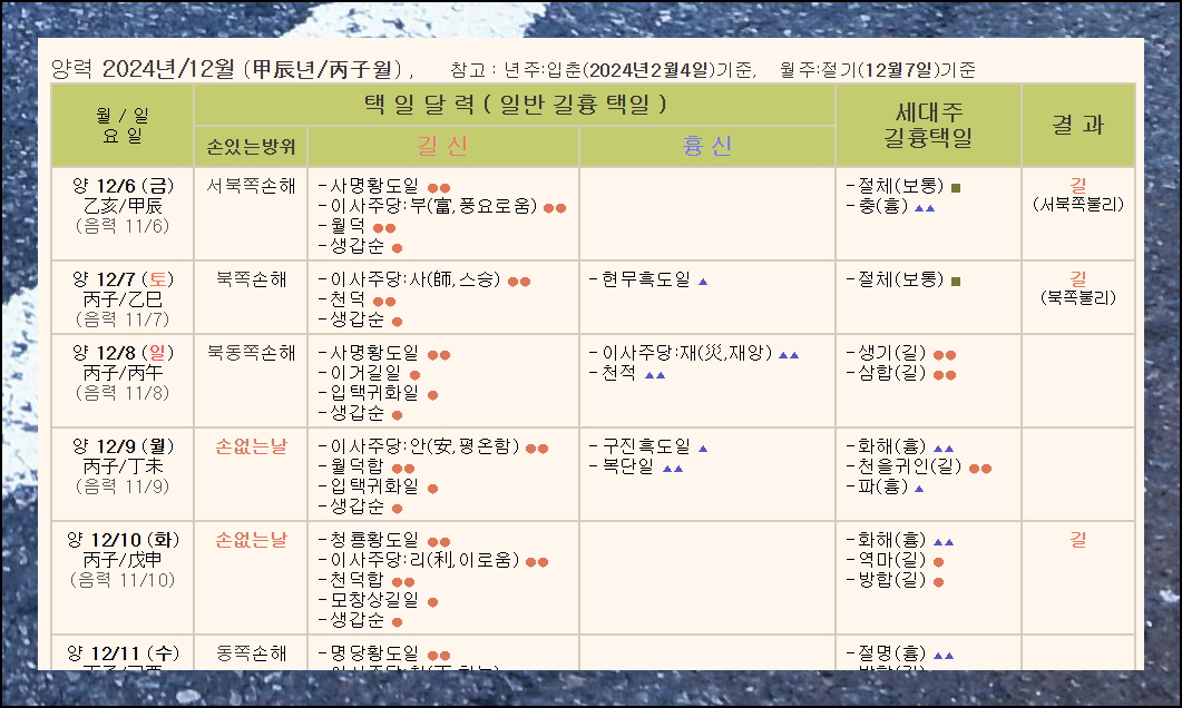 당신의 이사방향이 가져다주는 기운은 사람마다 각기 다릅니다. 특히 2024년 12월 초에는 특별히 주의해야 할 방위들이 있어요. 반대로 좋은 방위도 많이 존재합니다. 이 정보는 중요한 일을 할 때를 정할 택일에도 도움이 되는데요. 이제부터 전체적인 보는법을 자세히 설명해드리도록 하겠습니다.