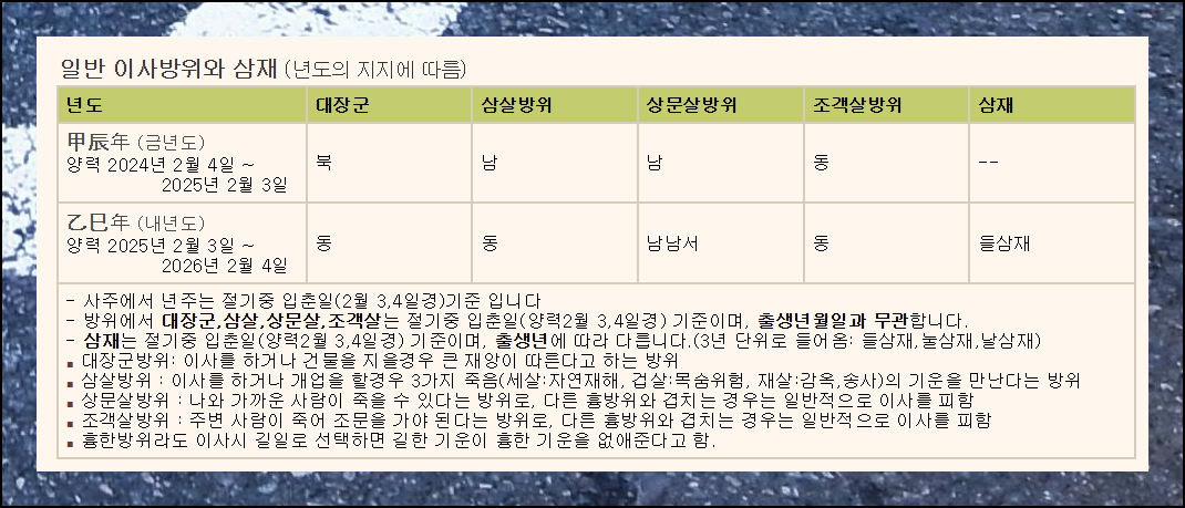 새 페이지에서는 다양한 운세 정보를 확인할 수 있어요. 특히 일반적인 방위와 삼재 정보를 통해 24년과 25년에 피해야 할 이사방향의 보는법을 자세히 설명해드립니다.
