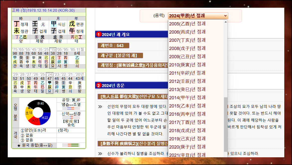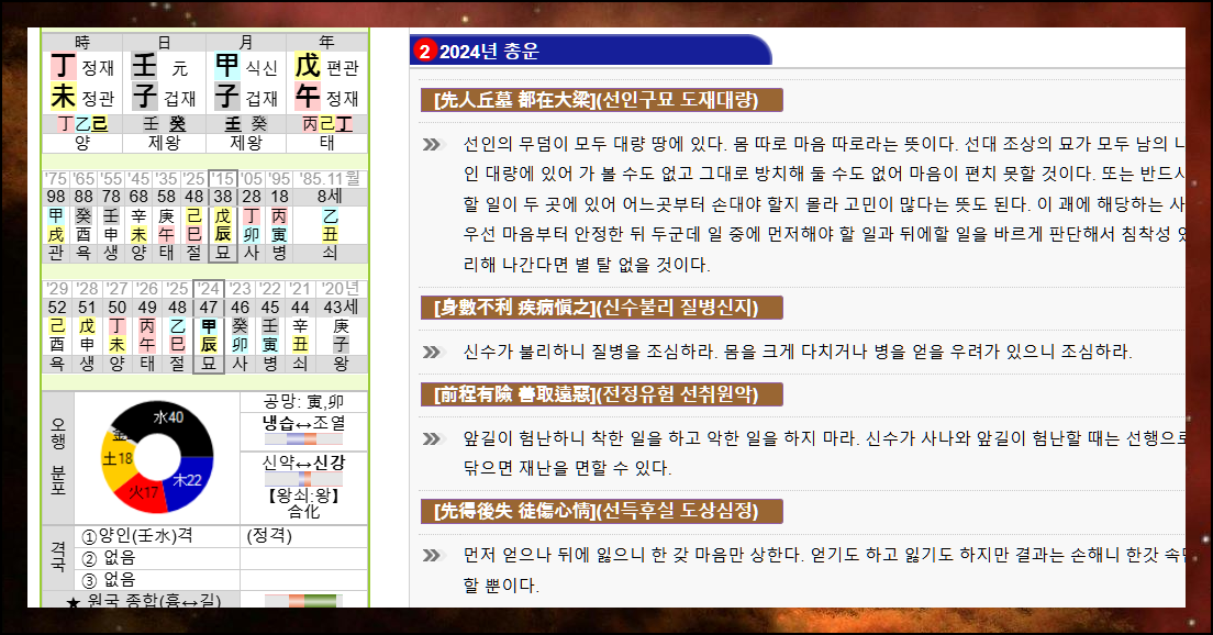 2024년 나에게 찾아오는 운을 보고 싶다면 먼저 총운을 살펴보세요. 사주풀이도우미는 한자어로 된 어려운 점괘마다 바로 아래에 쉬운 설명을 함께 제공합니다. 복잡한 점괘를 이해하기 쉽게 풀어서 설명해 주니 편리합니다.