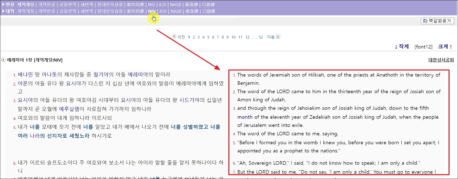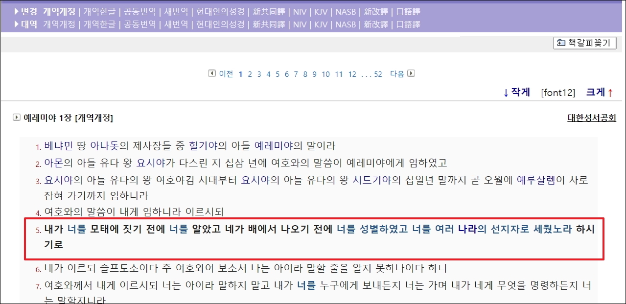 ▼영어로 읽고 싶거나 해당 구절을 영어 문장으로 바꿔서 보고 싶을 때에는 메뉴에 있는 [대역]에서 영어 버전의 성경을 선택하면 됩니다. NIV, KJV, NASR 이렇게 3가지가 있습니다.