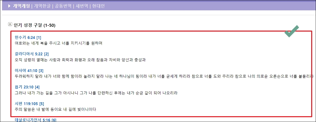 ▼인기 있는 문장을 골라서 보고 싶다면 홀리바이블 홈페이지에서 메인화면에 있는 [인기 성경 구절]을 살펴보면 됩니다. 여기에서 more 버튼을 누르면 더 많은 문장을 만나볼 수 있습니다.