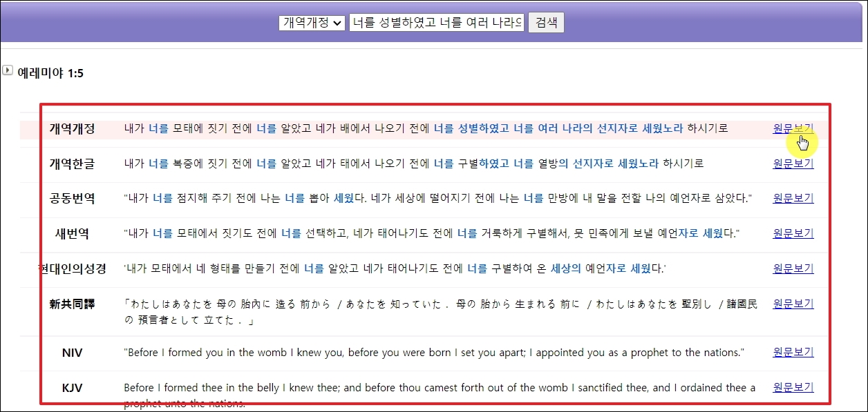 ▼번역 비교 기능을 사용하면 다음과 같이 개역개정, 개역한글, 새번역, 현대인의 성경, 공동번역, NIV, KJV 등 여러 버전의 성경에서 같은 의미를 가진 구절을 찾을 수 있습니다. 다르게 번역이 되었기 때문에 다른 문장처럼 보이지만, 읽어보면 같은 의미를 내포하고 있다는 것을 알 수 있습니다. 여기에서 찾은 문장을 포함한 페이지 전체를 만나보고 싶을 때에는 [원문보기] 버튼을 클릭하면 됩니다.