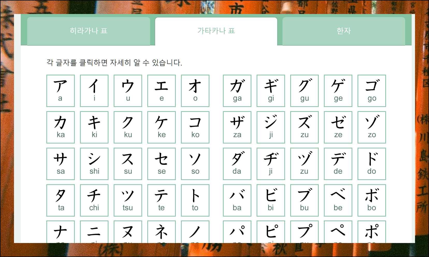 표에서 익히고 싶은 가타카나 문자를 선택해 보세요. 클릭 한번으로 발음을 들을 수 있어요. 발음을 정확하게 듣고 따라하면서 학습하면 더욱 효과적으로 익힐 수 있습니다. 반복 학습이 가능해서 실력 향상에 큰 도움이 되죠.