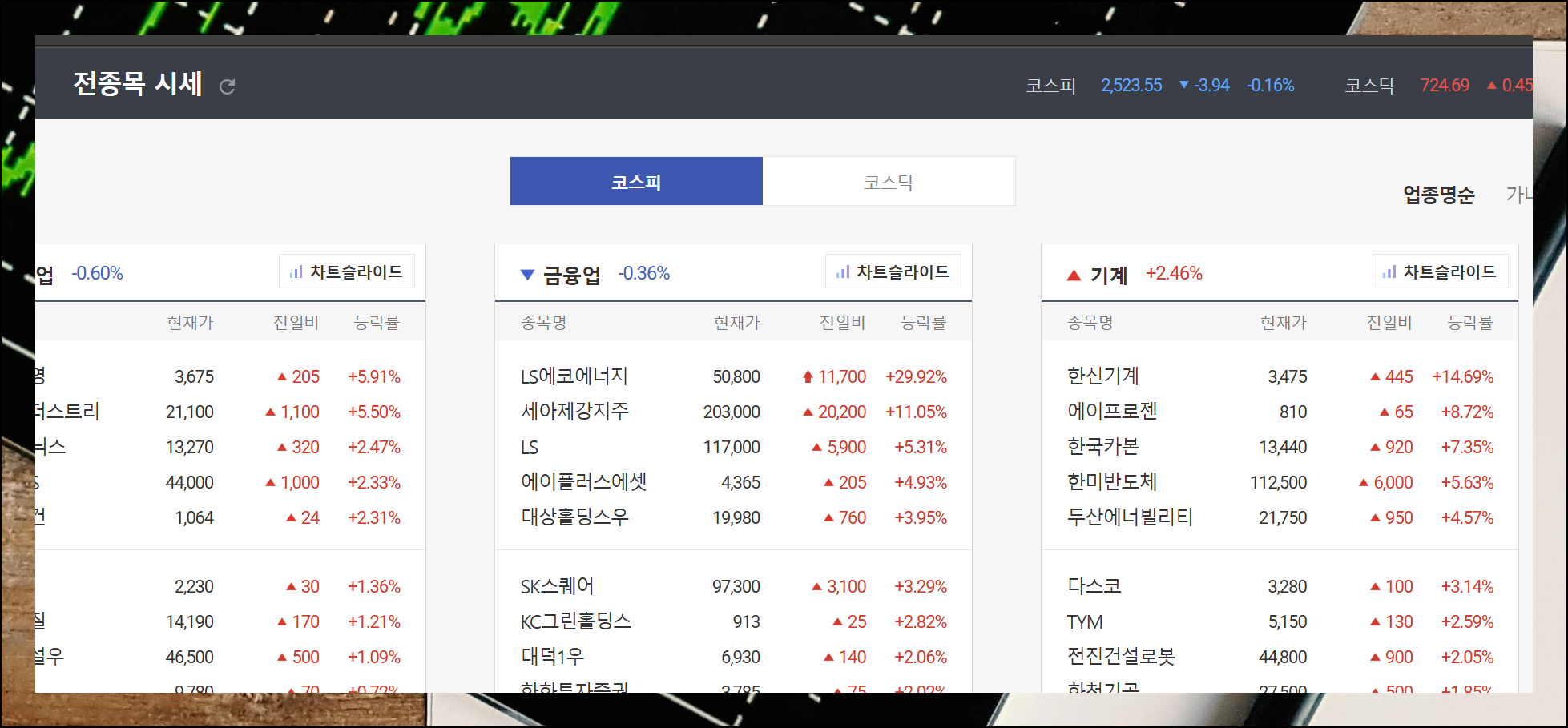 주식시세 정보를 업종별로 정리했습니다. 코스피와 코스닥에 해당하는 전종목을 비슷한 분야끼리 모아두어 시장 흐름을 쉽게 파악할 수 있어요. 특정 기업의 주식시세를 찾고 싶다면 가나다순 정렬 기능을 활용해 보세요.