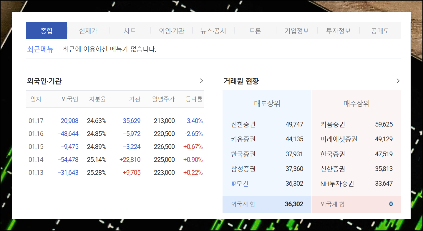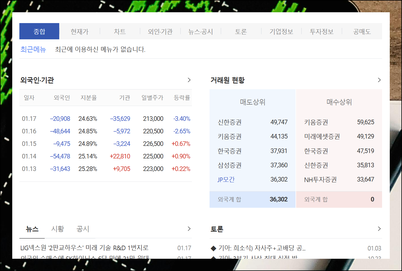 다음증권 사이트에서는 전종목에 대한 주식시세부터 기업 분석까지 무료로 확인할 수 있어요. 차트와 뉴스는 물론, 외국인과 기관의 실시간 매매 동향까지 한눈에 볼 수 있습니다. 초보 투자자도 쉽게 이해할 수 있도록 정보가 구성되어 있어요.