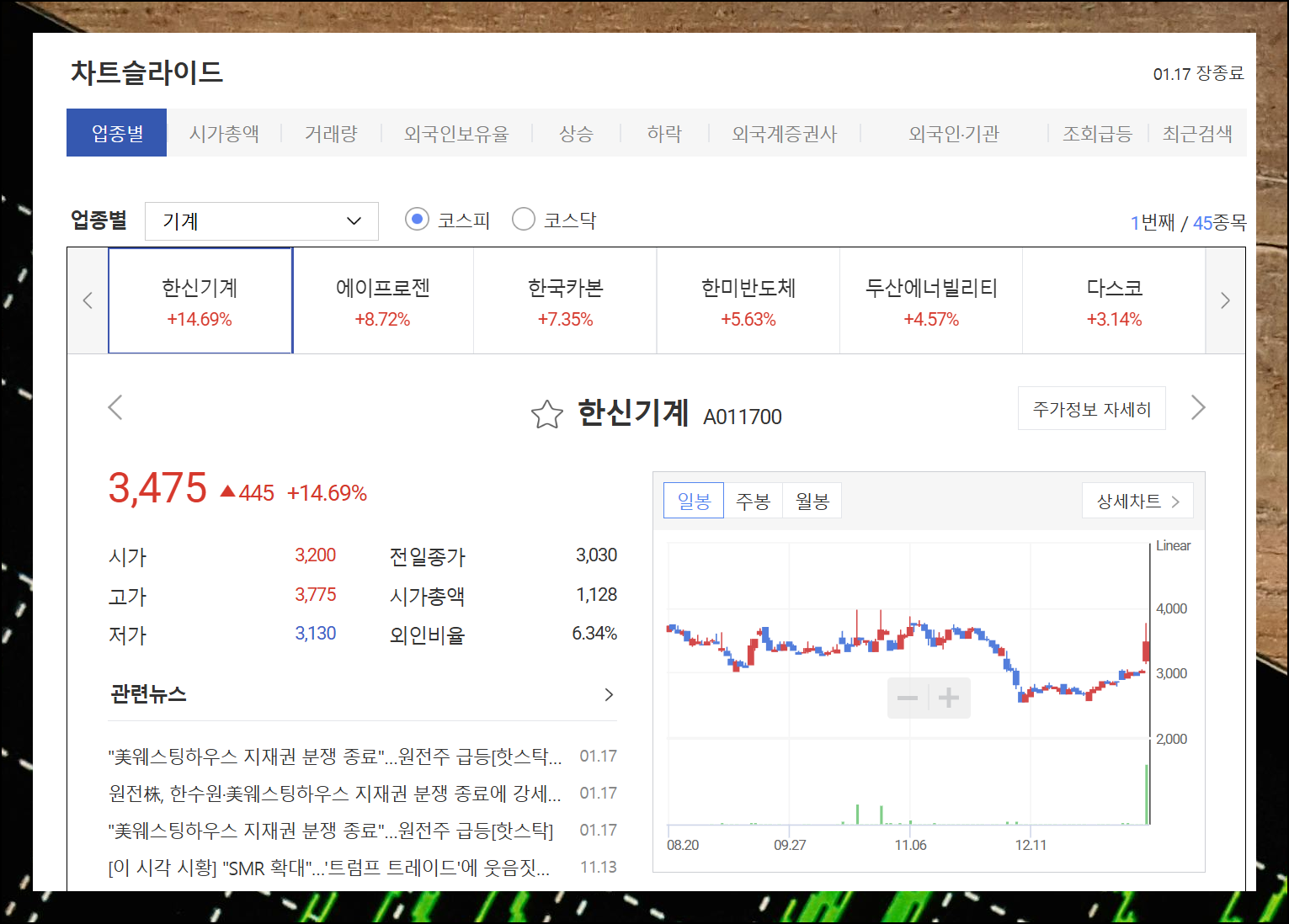 다음증권의 차트 슬라이드로 더욱 똑똑하게 분석해보세요. 바로 보는법을 통해 비슷한 특성을 가진 기업들을 쉽게 비교할 수 있습니다. 자동으로 넘어가는 차트를 보며 관심 있는 업종의 전종목 주식시세를 깊이 있게 살펴볼 수 있어요.