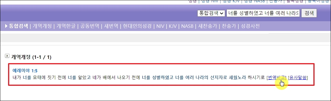 ▼제가 찾아본 결과, 개역개정 버전에 포함되어 있던 문장을 발견했습니다. 검색 결과를 보면 번역 비교와 유사 말씀을 찾아볼 수 있는 기능을 사용할 수 있도록 되어 있습니다.