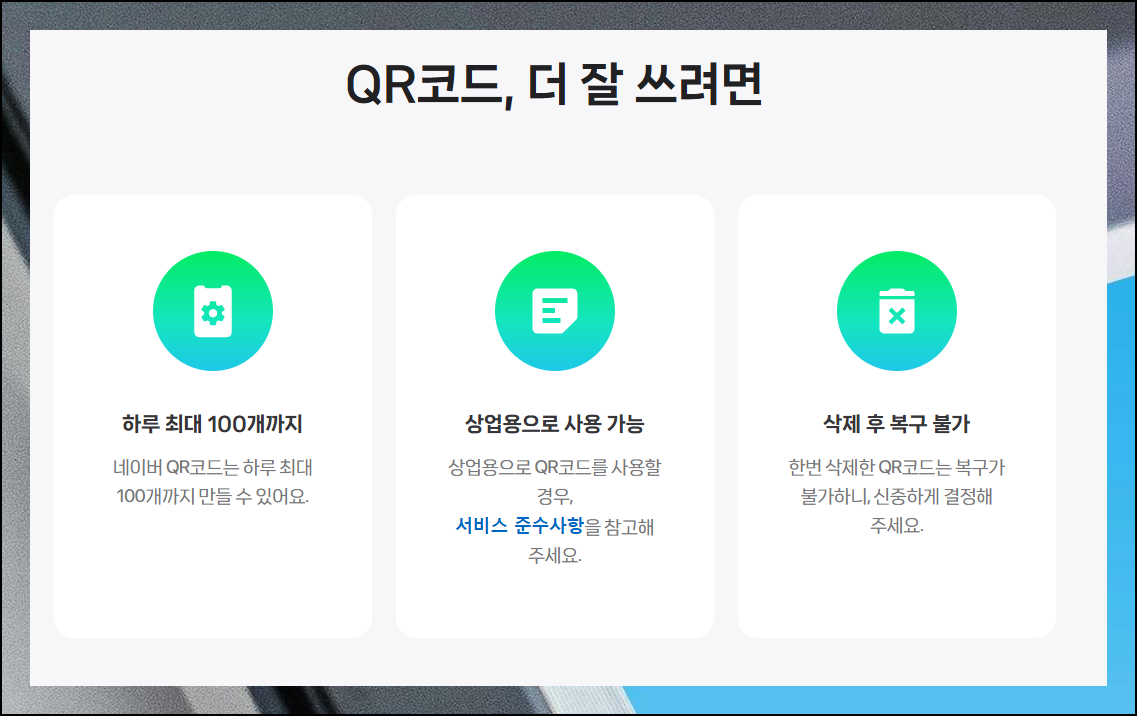 이번에는 우리가 직접 QR코드를 만드는 방법을 알려드릴게요. 정말 쉽기 때문에 한 번만 진행해 보면 혼자서 쉽게 만들 수 있어요. 네이버의 서비스를 이용하면 되는데요. 해당 사이트에 접속해 주세요.
