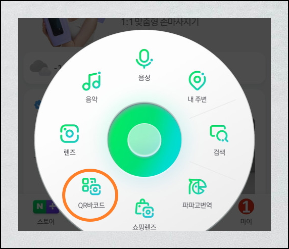 네이버 앱을 실행한 후 검색 버튼 오른편에 있는 녹색원을 누릅니다. 그럼 화면 중앙 하단에 보면 녹색으로 된 동그라미가 있는데요. 동그라미를 터치해 보세요. 그럼 여러 가지 관련 서비스가 나타날 거에요. 여기서 QR코드 스캔하는 방법을 따라하실려면 [렌즈]를 선택하면 돼요.