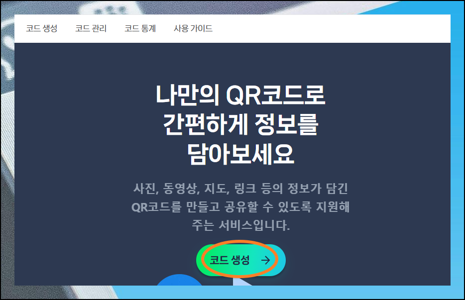 사이트에 접속하면 QR코드를 만들거나 스캔하는 방법에 대해 설명이 나와 있는데요. 제가 알려드리는 것 외의 설명을 확인하고 싶은 분은 참고해 주세요. 그럼 메뉴에 있는 [생성] 버튼을 클릭해 주세요.