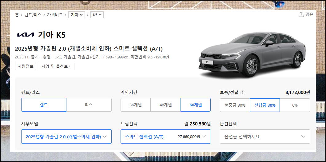 특정 모델을 예시로 들어볼까요. 렌트 기간과 보증금을 입력하고 세부 모델을 고르면 구체적인 월 요금이 나타납니다. 옵션에 따라 비용이 크게 달라질 수 있으니 신중하게 선택하세요. 장기렌트의 장점을 최대한 활용해보세요.