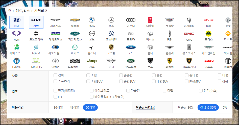 원하는 신차를 고르는 과정이 시작됩니다. 브랜드와 차종, 연료 유형을 선택해주세요. 이용 기간과 보증금 설정에 따라 월 납입금이 조정돼요. 나에게 딱 맞는 장기렌트 조건을 찾아보세요.