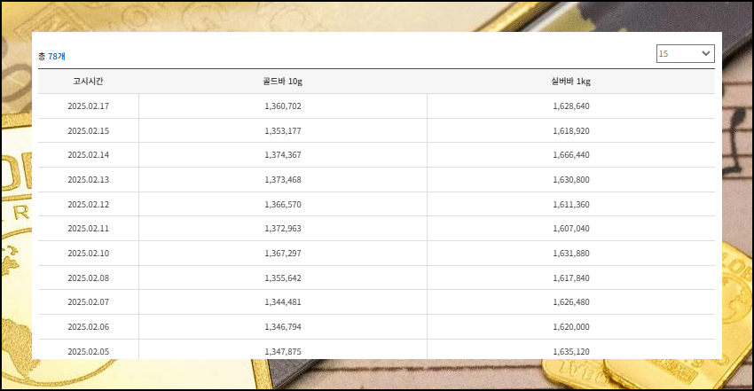 골드바 10g과 실버바 1kg 가격표도 쉽게 볼 수 있어요. 구체적인 수치로 모든 데이터가 기재되어 있어서 신뢰할 수 있는 거래가 가능합니다.