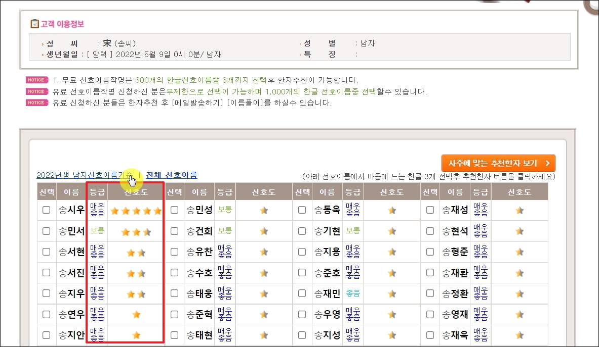 ▼꽤 많은 결과를 표로 확인할 수 있습니다. 여기에서 등급을 통해 얼마나 좋은 것인지 파악할 수 있습니다. 선호도는 멋지거나 예쁜 정도를 반영한다고 보면 됩니다. 올해 유행하는 것으로 추천을 받고 싶다면 [2022년생 남자선호이름기준] 버튼을 클릭합니다.