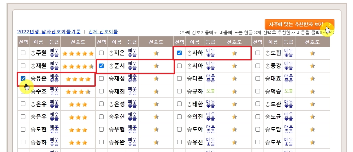 ▼2022년 올해에 유행하는 이름 리스트가 나왔습니다. 여기에서 마음에 드는 3가지를 선택한 후 [사주에 맞는 추천한자 보기] 버튼을 클릭해 봅니다. 그럼 선택한 내용을 바탕으로 한자 15개를 추천 받을 수 있습니다.
